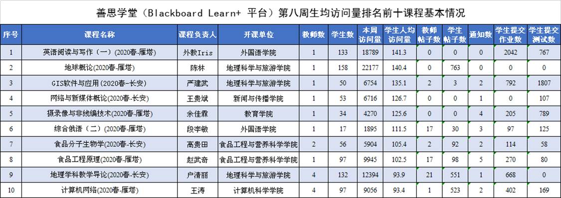 依托善思学堂(Blackboard Learn+平台)开展在线教学课程507门次。每门课程平均访问量1416人次。其中本周学生人均访问量排名第一的课程为外国语学院外籍教师Iris负责的“英语阅读与写作(一)”,学生人均访问量达141.3次(本周生均访问量前十的课程基本信息见附表)。在利用善思学堂开展师生互动方面来看,发帖量最高的课程为物理学与信息技术学院李贵安老师负责的“物理学科教材分析与教学设计”,发帖量达1600次,其中学生发帖量为1407次;教师发布作业次数最高的课程为bwin必赢唯一官方网站王超负责的“学科教材分析与教学设计”,发布作业次数为3次,学生提交作业1072个;教师发布测试次数最高的课程为外国语学院外教Iris负责的“英语阅读与写作(一)”,发布测试次数为15次,学生提交测试767个。