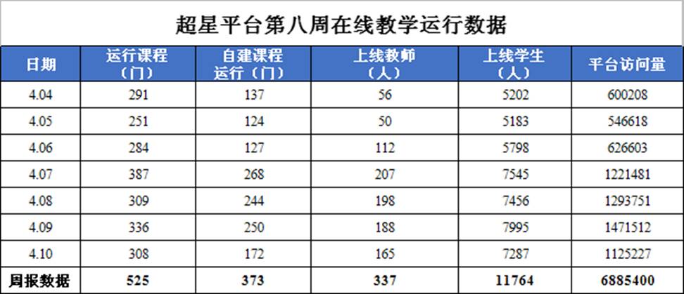 依托超星平台开展在线教学课程525门次课程,其中自建课程运行373门次,其中活跃课程302门次,新建课程7门次。共有337位教师在线上开展教学,上线学生一共11764人,平台访问量6885400人次。本周运行班级721个,教师一共在线上发布了签到、问答、选人等576个课堂活动,发起课堂讨论128个,发布课后作业53个,教师在线上批阅作业2394个,学生参与课堂活动10144人次,参与课堂讨论9726人次,完成作业1889人次。